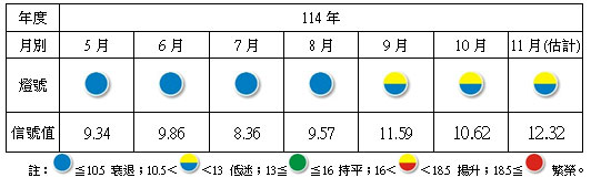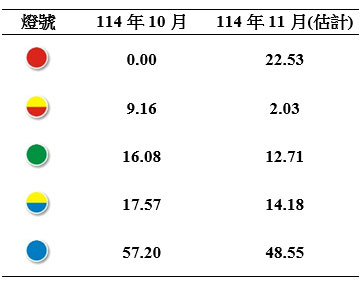 就114年11月份不同燈號的消長觀察,呈現衰退的藍燈比重由114年10月的57.20%減少至11月的48.55%,低迷的黃藍燈由17.57%減少至14.18%,持平的綠燈由16.08%減少至12.71%,揚升的黃紅燈由9.16%減少至2.03%,代表繁榮的紅燈由0.00%增加至22.53%。(參見表二)