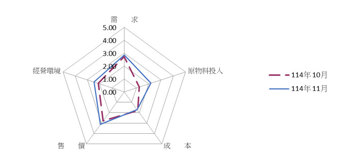 就114年11月景氣信號各主要組成項目觀察,4項分數增加、1項減少,經本院試算模型加權後,信號值增加1.70分,其中原物料投入面增加0.92分最多,售價面、經營環境面及需求面分別增加0.36、0.34與0.14分,而成本面減少0.06分。燈號落在代表景氣低迷的黃藍燈。