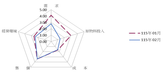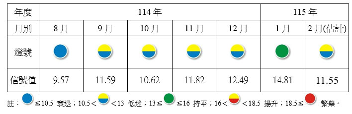 2月全球製造業PMI表現方面,除中國PMI連續2個月落在收縮區間外,美國、日本及歐元區PMI皆處於榮枯線之上,顯示全球製造業已出現復甦跡象。國內製造業,受農曆春節連假影響,工作天數減少,進出口、外銷訂單及生產指數年增幅表現較1月明顯下滑,進而拖累原物料投入及需求等面向指標表現。在股市方面,儘管2月台股仍受AI題材熱潮帶動而呈現上揚,但製造業廠商受工作天數減少影響,營收表現承壓,對當月景氣持悲觀看法的比重較上月明顯增加,進而拖累經營環境面指標表現。因此,整體製造業景氣信號值由115年1月之14.81分,減少3.26分至115年2月之11.55分,燈號由代表景氣持平的綠燈轉為低迷的黃藍燈。若扣除春節干擾因素,1-2月平均信號值為13.18分,燈號為代表景氣持平的綠燈。