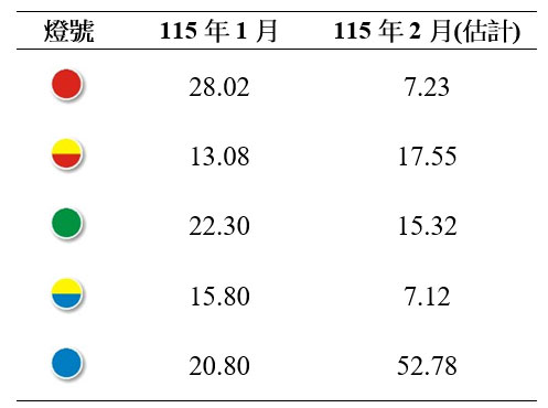 就115年2月份不同燈號的消長觀察,代表衰退的藍燈比重由115年1月的20.80%增加至2月的52.78%,低迷的黃藍燈由15.80%下降至7.12%,持平的綠燈由22.30%下降至15.32%,揚升的黃紅燈由13.08%上升至17.55%,繁榮的紅燈則由28.02%大幅下滑至7.23%。(參見表二)