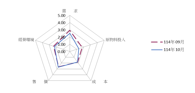 歐元區製造業採購經理人指數(PMI)出現復甦跡象,但成長力道仍不明顯;美國、中國及日本等國製造業PMI皆仍位處收縮區間,顯示全球製造業景氣尚未回暖。國內製造業方面,雖受惠於新興科技需求強勁,電子及資通訊產品出口表現亮眼,但外銷訂單及生產指數年增率皆較上月數值收斂,拖累原物料投入面及需求面指標表現。台股在市場預期美中貿易緊張情勢可能緩解情形下呈現價量齊揚,然傳統製造業廠商對當月景氣看法較上月調查明顯轉差,加上部分電子機械業廠商對未來半年景氣看法較上月調查時更趨於保守,影響經營環境指標表現。整體製造業景氣信號值由114年9月之11.59分,減少1.03分至10月之10.56分,燈號續為代表景氣低迷的黃藍燈。