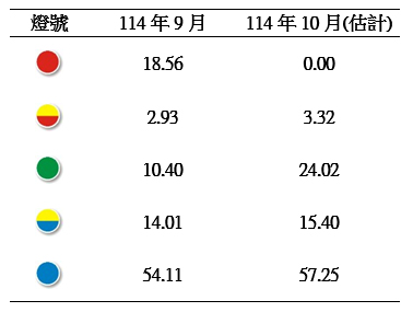 就114年10月份不同燈號的消長觀察,呈現衰退的藍燈比重由114年9月的54.11%增加至10月的57.25%,低迷的黃藍燈由14.01%增加至15.40%,持平的綠燈由10.40%增加至24.02%,揚升的黃紅燈由2.93%增加至3.32%,本月無代表繁榮的紅燈。(參見表二)