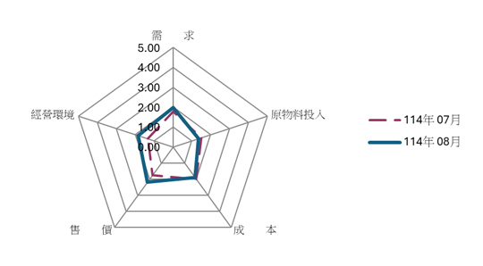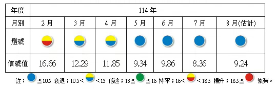 就114年8月景氣信號各主要組成項目觀察,有2個項目分數減少、3項增加,經本院試算模型加權後,信號值增加0.88分,其中在分數減少方面,以原物料投入減少0.15分幅度最多、成本面減少0.11分次之;在分數增加方面,經營環境面增加0.50分最多,售價面及需求面分別增加0.43及0.22分,燈號座落於代表景氣衰退的藍燈。