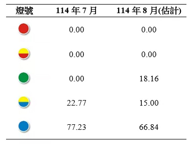 就114年8月份不同燈號的消長觀察,呈現衰退的藍燈比重由114年7月的77.23%減少至8月的66.84%,低迷的黃藍燈由22.77%減至15.00%,持平的綠燈由0.00%增加至18.16%,本月無代表揚升的黃紅燈及繁榮的紅燈。(參見表二)